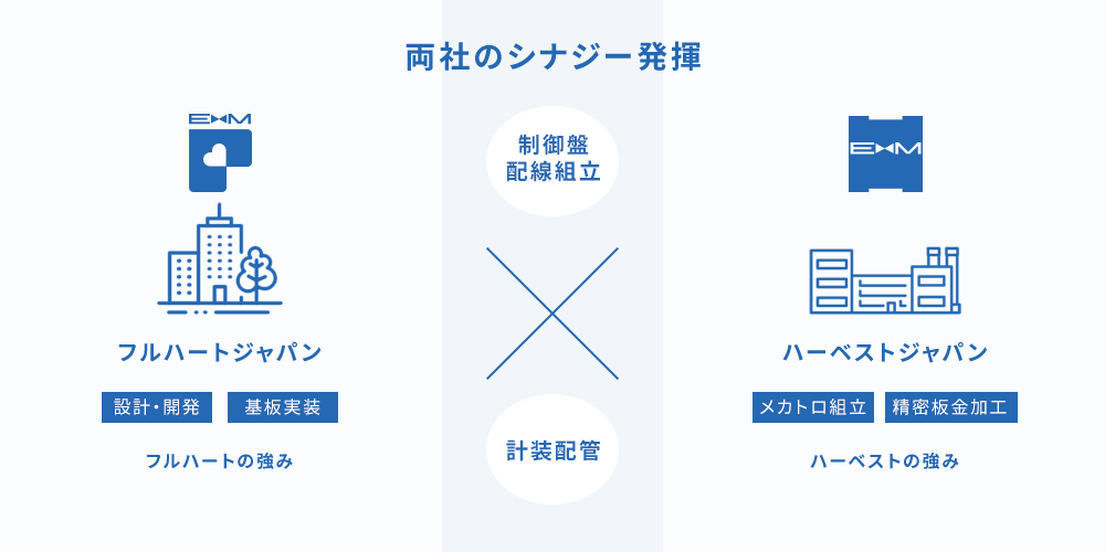 Daisan Denki Co., Ltd (predecessor of Fullheart Japan), founded in 1968 for wiring assembly of electronic devices in Ota Ward, grew through design and production of industrial computer control equipment. In 1991, the company name changed to Fullheart Japan, and Harvest Japan more specialized in sheet metal working and wiring assembly of electronic devices was also founded. Both companies are like a family and create the synergy as “one company”, taking advantage of the strength of both companies. We will continue to respond to various customer needs utilizing advantages of both.