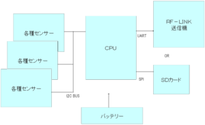 CPUは、I2Cで接続されたセンサーより計測データを受け取り、定期的にRF-LINK送信機で地上局へデータを送信する。